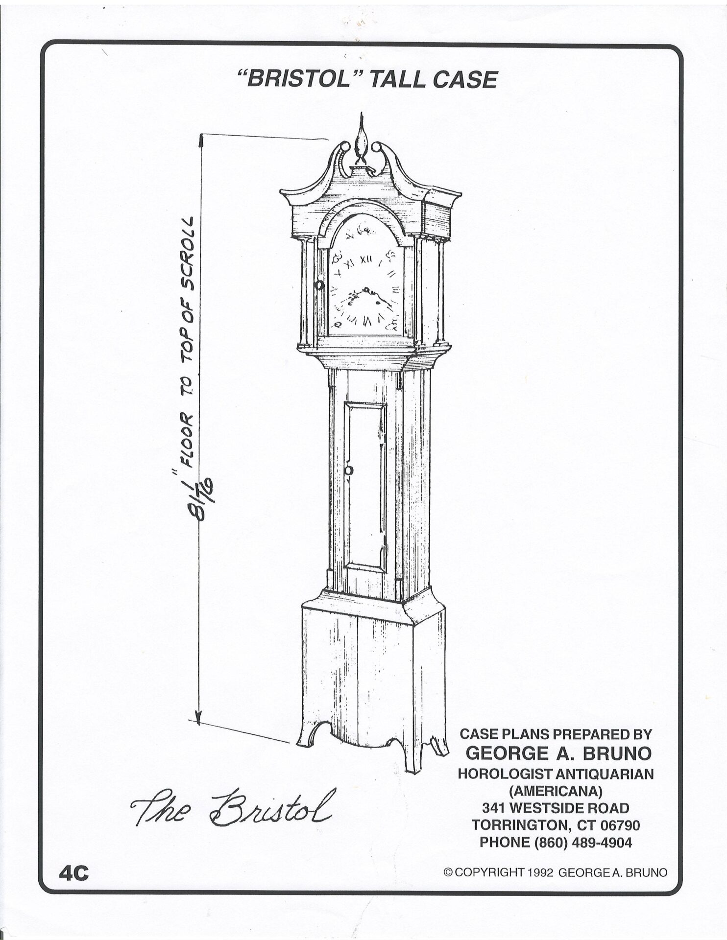 Measured drawings and explanations for building a handsome scroll top country style “grandfather” clock case 81 1/16″ tall plus 3 1/4″ for a finial. This case is suitable for any old wooden gear tall clock movement or a reproduction Terry or Hoadley style wooden gear movement with a 12 inch dial. An old or new brass tall clock movement could fit this case as well. Stock #155